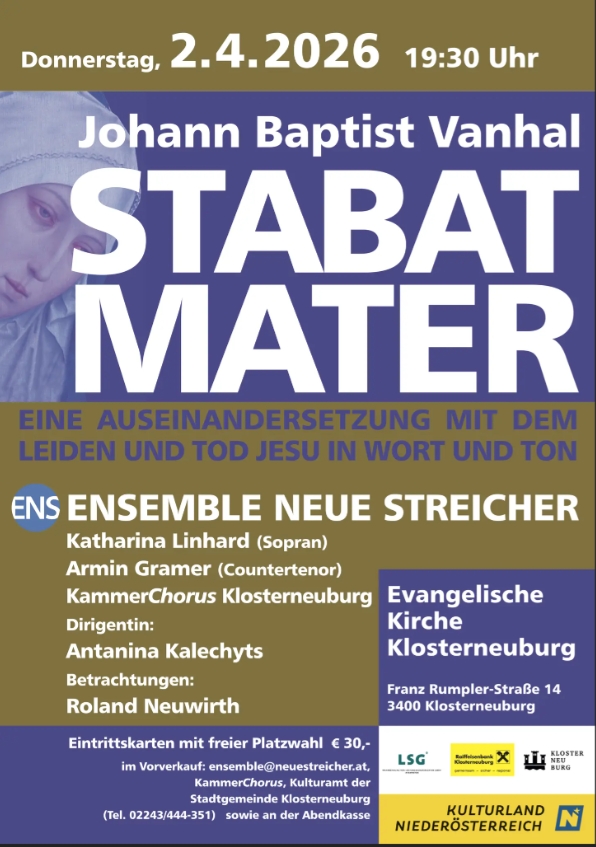 Als Solisten konnten Monika Hosp-Sopran, Armin Gramer-Counter und Georg Lehner-Bass gewonnen werden, es spielt das Ensemble Neue Streicher, Orgel Yi-Ting Wu-Mittermayer. Der Eintritt ist frei, um angemessene Spende wird gebeten.